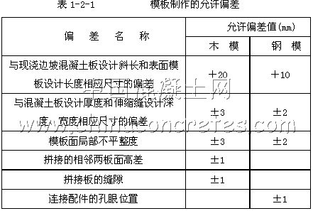 模板是混凝土工程的重要輔助作業(yè),其主要作用是對新澆混凝土起成型和支撐作用,同時(shí)還具有保護(hù)和改善混凝土表面質(zhì)量的作用。根據(jù)制作材料,模板可分為木模板、鋼模板、混凝土模板、鋼筋混凝土預(yù)制模板。在中小型水利工程中一般使用木模板和鋼模板。在制作加工時(shí)模板的允許的偏差應(yīng)符合表1-2-1的規(guī)定要求。模板的安裝必須按照設(shè)計(jì)圖紙測量放樣,對重要結(jié)構(gòu)應(yīng)多設(shè)控制點(diǎn),以利于檢查校核。模板要求拼裝嚴(yán)密準(zhǔn)確,不漏漿,表面平整,不產(chǎn)生過大變形。現(xiàn)澆砼模板安裝凈距沿渠道縱向的允許偏差值為±10mm,沿寬度方向的允許偏差值為±30mm。安裝尺寸允許偏差值不得超過《水工混凝土施工規(guī)范》的規(guī)定。