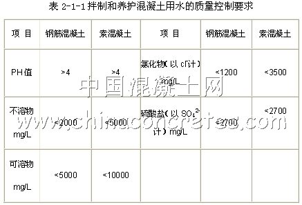 凡可以飲用的水均可用于拌制和養(yǎng)護(hù)混凝土。未經(jīng)處理的工業(yè)廢水 ,污水及沼澤水不能使用,如果在極其缺水的艱苦條件下,也可以使用其它水如地表水、地下水或其它類型的水,但必須符合《水工混凝土施工規(guī)范》,方可使用。對鋼筋混凝土及預(yù)應(yīng)力混凝土工程不允許使用海水。拌制和養(yǎng)護(hù)混凝土用水還應(yīng)符合表2-1-1要求。