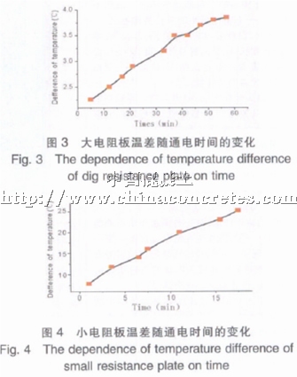 裂紋深度相同, 但碳纖維含量與組分的不同會導致試樣的電阻不同, 產生的熱效應不同, 最終引起紅外熱像的不同。考慮阻值不同的影響, 采用裂紋深度相同( 20mm) 的兩類試樣進行比較, 一類碳纖維含量較低, 裂縫預制為沿深度方向整齊的切口, 由于切口處無碳纖維搭接, 因此制得的試樣電阻值較大( 幾千歐姆) , 直流通電時需采用相對較高的電壓。二類碳纖維含量較高, 且加入了增加導電性的硅灰成分, 裂縫的預制更接近自然情況。先在試樣表面切出淺槽, 再采用彎折的方法萌生裂紋, 由于裂紋尖端破碎區內碳纖維并未完全斷開, 因此盡管裂紋較深, 但試樣電阻仍然較小( 幾十歐姆) 。通電時需采用較低的電壓( 低于36 伏) 就可以在紅外熱像圖上明顯地看到裂紋所在, 并可以通過調節電壓的高低來改變溫升值。實驗表明: 板表面溫度在中心線附近明顯高于其他區域, 裂紋即位于中心線上, 對大小電阻兩類試樣, 表面最高溫差隨時間的變化為圖3、圖4。