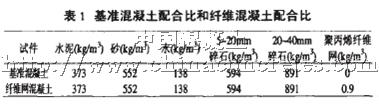 試驗用混凝土為牡丹江牌普通硅酸鹽水泥42(5# 摻火山灰),砂為松花江產(chǎn)中砂,粗集料為阿城產(chǎn)碎石,纖維摻量為0.9kg/m3,混凝土配合比如表1 所示。聚丙烯纖維網(wǎng)最突出的優(yōu)點是分散均勻、便于施工,無須改變原有水泥混凝土的施工方法和混凝土配合比,這也是有別于其它纖維( 鋼纖維等)優(yōu)點之一。攪拌方法與普通混凝土一致,拌和時間取4 分30s。