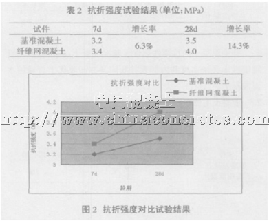 從試驗結(jié)果來看,聚丙烯纖維網(wǎng)( FibermeshTM)對提高水泥混凝土的抗折強度有一定效果,無論7d 還是28d 齡期,試件的抗折強度都高于基準混凝土試件。