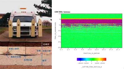 GPR測速可以達到80km/h以上,可用于路面與機場道面結構層厚度檢測;脫空識別;地下異物識別,如鋼筋,燃氣管道,排水管道等;含水量、壓實度評價等。如圖1所示,其原理是通過對雷達反射信號的接收、處理與分析,可以找出路面脫空的可疑位置、程度、范圍等。由于反射信號受各種噪聲的影響較大,應重點研究判別的準確性。為此,采用FWD驗證、人工開挖驗證是必須的,有助于建立反射波形與實際脫空狀況的對應關系,豐富和積累GPR的使用經驗。