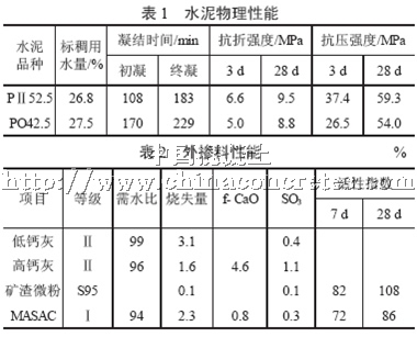 外摻料:分別為普通低鈣灰,45 μm 篩篩余量14.8%;高鈣灰,45 μm 篩篩余量16.8%;礦渣微粉,比表面積424 m2/kg和改性粉煤灰MASAC(商品名),比表面積486 m2/kg,其它性能見(jiàn)表2;碎石:5~20 mm 連續(xù)級(jí)配;中砂:細(xì)度模數(shù)2.4;外加劑選用萘系高效減水劑,減水率16%。