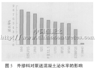 選擇具有一定引氣組分的外加劑,在泵送混凝土中引入穩(wěn)定性較好、分布均勻的封閉氣孔,減小固相顆粒的沉降速度,切斷泌水通道。對(duì)上部結(jié)構(gòu)的混凝土配比,應(yīng)選用凝結(jié)時(shí)間適中的泵送劑,適當(dāng)控制礦渣微粉摻量。如過(guò)度緩凝將延遲水泥水化進(jìn)程,水化產(chǎn)物不足以填充切斷泌水通道,增加泌水量。