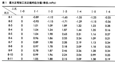 試驗梁跨中和橋墩位置應力測試點布置見圖5。跨中應變片由西至東編號為8-1,8-2,…,81-11。復雜結構梁跨中截面(1/2截面)在最大正彎矩工況時汽車擺放的位置見圖6,其對應的應力值見表1。