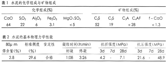 水泥:采用湘鄉(xiāng)42.5普通硅酸鹽水泥,其化學(xué)組成、礦物組成及物理力學(xué)性能見表1、表2。