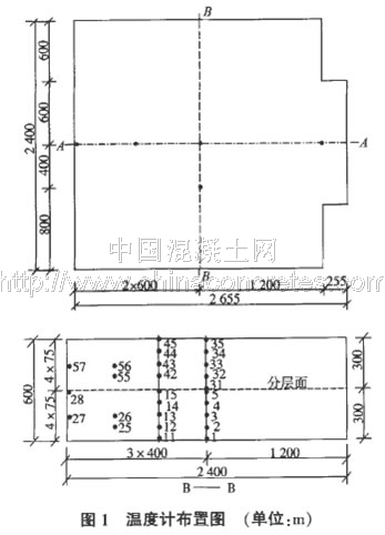 儀器的布點按照突出重點、兼顧全局的原則。根據結構的對稱性和溫度變化的-般規律,儀器主要布置在相互垂直的兩個中心斷面上,每個中心斷面又以其中半個斷面為重點。為配合施工,23#承臺的溫度計布置在左幅,每幅埋設60支溫度計。儀器的布點如圖1所示,每幅承臺中,儀器的位置和數量完全相同。