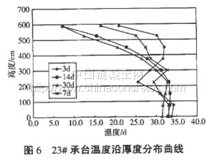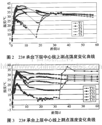 23#承臺按監測要求監測,取得了較好的效果。根據23#承臺的結果,至觀測結束時為止,儀器全部完好,儀器完好率為100%。從觀測結果看,所有測值均有很好的規律性,正確地反應了混凝土的實際溫度。觀測數據為指導溫度控制、保證承臺質量提供了科學數據。
