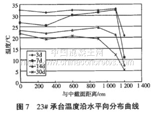 圖7為承臺沿水平方向的溫度分布,即沿承臺上層1/2高度截面中心線(順水流)上的溫度分布,由于溫度分布對稱,圖中僅示出1/2,0點為截面中點。由圖7可以看出,盡管齡期不同,沿水平向各測點的溫度都基本相同,但距截面中心30cm的點和邊界點除外。距截面中心30cm點的溫度較其它點偏低,分析其原因可能是距冷卻水管近,散溫更多所致,邊界點溫度偏低則是由于外部氣溫的影響。14d齡期后,距邊界l00cm的點也受到氣溫的影響。由此得出,承臺溫度分布與板的熱傳導理論相符,只有距邊界小于100cm的點受氣溫的影響較大。