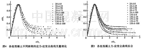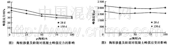 從圖1中可以明顯看出如下特征。1)隨陶粒摻量的增加,曲線上升段的斜率依次變小,表示配制的混凝土彈性模量依次降低。這是由于輕骨料自身的彈性模量較低,剛性小,抑制水泥石基體應變的能力弱的緣故。2)隨著陶粒摻量的增加,曲線下降段的坡度變得越緩,這一方面是由于陶粒的摻人使得混凝土的強度有所降低,而強度的大小又是決定曲線下降段形狀的最重要的因素;另一方面,當試件所承受的荷載超過峰值應力時,由初始裂縫形成的可見裂縫發生并不斷被新的貫穿裂縫分割直至形成主要貫通裂縫,這一形成過程中許多應力集中使得混凝土破壞速度加快,而彈性模量較低的輕骨料的摻人延緩了這種現象的發生。3)隨著混凝土養護齡期的增長,各組混凝土的上升段更接近于直線,下降段更陡,峰值應力均增長,而峰值應變卻有所降低。不過150d齡期時各條曲線隨陶粒摻量的變化規律與28 d的類似。