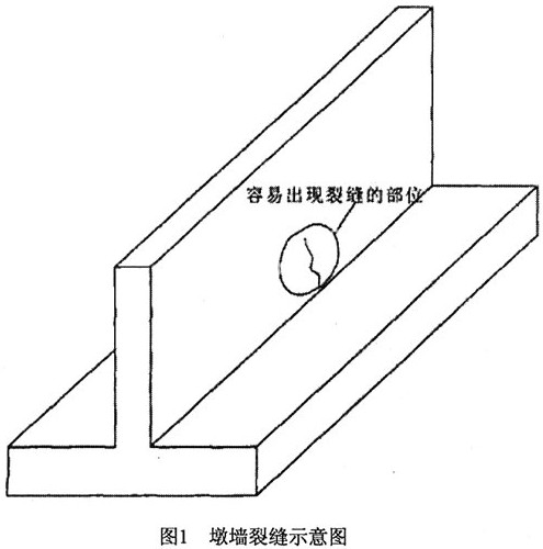 水工涵閘混凝土墩墻結構經常出現“上不著頂,下不著底”的“棗核形”裂縫現象,像湖北荊江分洪北閘的閘墩、石梁河新泄洪閘的閘墩的裂縫,都是這種形式的裂縫。筆者原所在單位曾施工的仙桃市展翅長河三合垸閘的閘墩也曾出現過類似的裂縫,裂縫通常發生在施工期間的混凝土的表面,隨后裂縫繼續向內部深進,由于水工涵閘的墩墻較窄(一般只有lm左右),裂縫很容易貫穿整個墩墻,形成貫穿性的危害性很大的裂縫,貫穿裂縫多發生在澆筑后2-3個月或更長時間??p寬受外界環境溫度的變化影響較明顯,冬季較寬,夏季較細。由于底板和墩墻混凝土的自身約束,沿截面高度方向,裂縫大多呈中間寬兩端窄的“棗核形”。從混凝土表面看,裂縫底部通常是豎直的,而頂部則向兩邊傾斜。圖1是裂縫容易出現的部位的示意圖。