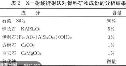 采用X-射線衍射法對骨料的礦物成份進行了分析,結果見表2。