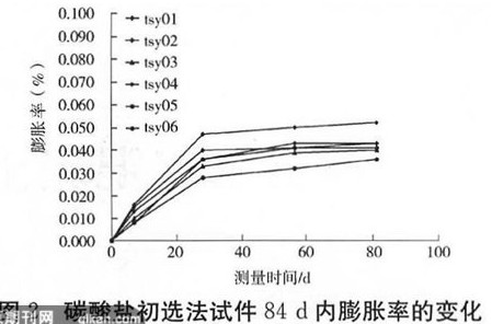 碳酸鹽初選法:按文獻[4]中5.4方法進行。共制作1組6個試件,試件浸泡84 d后膨脹率在0.1%以上時,該骨料應評為具有潛在堿活性危害。