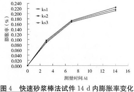 快速砂漿棒法:按文獻[4]中5.5方法進行。共制3組9個試件,在80℃、95%濕度的條件下養護,分別測量試件3 d、7 d、14 d的膨脹率。當14 d膨脹率小于0.1%,即評為非活性骨料,若14 d膨脹率大于0.2%,則評為具有危害性的活性骨料。如果14 d膨脹率介于0.1%~0.2%之間時,則應將觀測時間延至28 d,再進行綜合評定。