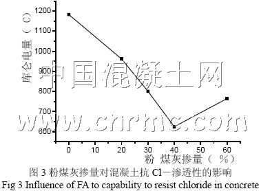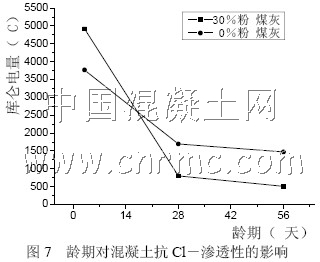 4.隨齡期的增加,普通混凝土與粉煤灰混凝土抗Cl-滲透性能都提高,但是粉煤灰混凝土提高的幅度較大。