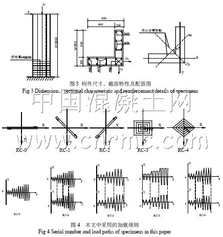 目前國內外對鋼筋混凝土框架柱在雙向任意加載路徑下的受力性能已有一定的研究[1-3],但僅限于對普通矩形柱的研究,對L形柱的研究也只限于沿某一工程軸或斜向加載下的受力性能上[4-7]。這與目前可進行多維擬靜力試驗的設備、設施較少,特別是試驗加載控制較為困難,沒有相應的多維加載控制軟件有關[1]。由于現(xiàn)有鋼筋混凝土L形柱抗震性能的評定主要是建立在沿某一工程軸這一特定的加載路徑的試驗研究基礎之上,為建立和完善鋼筋混凝土異形柱抗震性能的評定方法,提供必要的理論依據(jù),有必要對鋼筋混凝土L形柱在不同雙軸加載路徑下的受力性能進行研究。