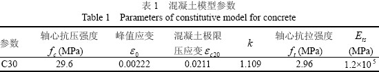 本文對5 根軸壓比均為0.2,且有相同尺寸和配筋的鋼筋混凝土L形柱在不同加載路徑下的抗震性能進行了研究。各構件的混凝土強度等級均為C30,混凝土保護層厚30mm,縱筋強度fy 取值為388N/mm2,箍筋強度fyv 取值為272N/mm2,彈性模量Es取值為2.0×10 MPa,E‘取0.1Es , k 為考慮箍筋約束所引起的混凝土強度增加系數(shù)。混凝土模型參數(shù)見表1。由于纖維模型目前尚不能考慮扭轉、剪切的影響,本文構件剪跨比均設計為H/h=3.5,較實際工程應用有所偏高以保證模擬分析結果的足夠準確性[12],同時在進行加載時水平荷載作用點通過截面彎心,即不考慮實際可能同時出現(xiàn)的扭轉影響。構件尺寸和配筋如圖3。
