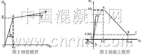 本文中的鋼筋模型選用最初由Menegotto和Pinto(1973)所建議后經(jīng)Filippou等人修改以考慮等向應變硬化影響的雙線型本構模型[11],如圖1。對于混凝土,采用Scott等人擴展后的Kent-Park模型,如圖2 所示。通過修改素混凝土(無約束混凝土)受壓骨架線應變軟化段斜率來考慮箍筋對混凝土的約束影響。