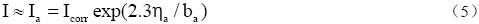 當施加的電流對鋼筋產生陽極極化時,假定鋼筋電位處于Tafel 區域,此時的陽極極化電流可近似認為是外測電流[24,25]: