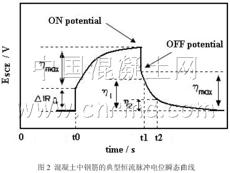 一旦外加電流被切斷,歐姆降ΔIRΩ 對電位ηt 的貢獻迅速消失,時間短至幾毫秒,此刻的電位反映出鋼筋的真實極化電位。隨后鋼筋電位隨著時間呈指數形式衰減,如下式: