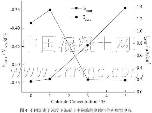 圖4 所示為不同Cl-含量試樣的自腐蝕電位Ecorr 和線性極化測試結果得到的腐蝕電流Icorr。正如預計,隨摻入的Cl-含量升高,鋼筋腐蝕程度加劇,即自腐蝕電位Ecorr 隨著氯含量的升高而下降,同時腐蝕電流Icorr 大幅上升。尤其是Cl-摻量為5%的試樣,其腐蝕電流超過了1μA/cm2,可以認為其腐蝕速率較大。值得注意的是,氯含量為0%試樣的自腐蝕電位與1%試樣較為接近,其腐蝕速率高于0.1μA/cm2,表明已經處于腐蝕狀態。究其原因,可認為是由于經過多次噴灑氯鹽之后,在干濕交替作用下鹽分已逐漸侵入混凝土內部并到達鋼筋表面,造成鋼筋腐蝕。在混凝土表層干濕交替的過程中,當表層風干到一定程度時,氯化物能依靠混凝土毛細管吸收作用逐漸侵入混凝土內部,且風干程度越高,毛細管吸收作用越大。在下一次再被海水潤濕時,又有更多的鹽分以溶液形式帶進混凝土的毛細管孔隙中。因此造成由混凝土表層指向內部鋼筋的氯化物濃度差被不斷拉大,加速了氯化物的擴散。隨著時間的推移,最終將有足以使鋼筋去鈍化的氯化物到達鋼筋表面。
