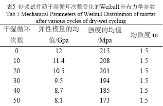 為了反映海水侵蝕作用對(duì)混凝土性能的影響,根據(jù)混凝土的配比制成了砂漿試件并對(duì)其進(jìn)行了10次、20次、30次、40次和50次的干濕循環(huán)試驗(yàn),在干濕循環(huán)后分別進(jìn)行了劈裂抗拉試驗(yàn)和單軸壓縮試驗(yàn)測得了其抗拉強(qiáng)度、抗壓強(qiáng)度和彈模。利用式(2)和式(3)得到了數(shù)值模擬時(shí)砂漿基質(zhì)在Weibull分布賦值時(shí)的彈性模量和強(qiáng)度的均值,見表5。