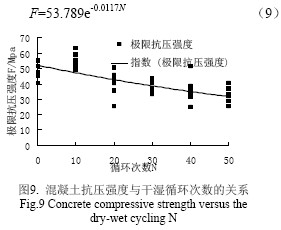 (3)根據(jù)試驗(yàn)結(jié)果和計(jì)算結(jié)果,建立了混凝土隨干濕循環(huán)次數(shù)變化的抗壓強(qiáng)度折減模型: