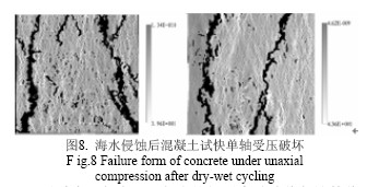 眾所周知,混凝土在海洋與沿海、道路除凍鹽、鹽堿地、工業(yè)鹽環(huán)境中會(huì)發(fā)生侵蝕破壞,這種破壞的主要原因是混凝土遭受環(huán)境中氯離子、鎂離子和硫酸根的侵蝕,這些有害離子通過混凝土孔隙進(jìn)入到內(nèi)部,并與混凝土中的氫氧化鈣及水化鋁酸鈣作用生成新的鹽類物質(zhì),生成的難溶鹽類物質(zhì)往往產(chǎn)生較大的體積膨脹,在孔隙的內(nèi)部產(chǎn)生很大的內(nèi)應(yīng)力,長期的積累會(huì)使混凝土開裂;一些可溶性的鹽在海水的反復(fù)沖刷下溶解析出,使混凝土孔隙率增加,增大了氯離子滲入混凝土內(nèi)部的孔道,加劇了鋼筋銹蝕,并使混凝土漲裂剝落。另外,如果水灰比控制不嚴(yán),施工質(zhì)量較差,混凝土振搗不密實(shí),甚至出現(xiàn)蜂窩麻面等現(xiàn)象,這些都會(huì)加劇鹽溶液環(huán)境對(duì)混凝土的侵蝕,使結(jié)構(gòu)變得松軟,強(qiáng)度降低,耐久性下降[2]。