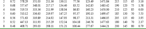 計(jì)算各級(jí)粒徑的通過(guò)率,其中n 冪值0.48~0.72;粉煤灰150g~200g;環(huán)氧樹(shù)脂95g~135g;固化劑55g~95g;鋼纖維42g~66g。試件尺寸40mm×40 mm×160mm, 因每組三塊試件,拌合量為1870g。5 個(gè)因素、8 個(gè)水平,因此選用均勻設(shè)計(jì)表