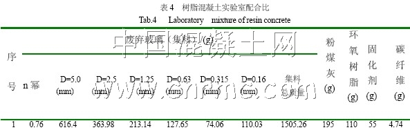 為了最大限度地回收和利用廢棄玻璃、粉煤灰,充分考慮各影響因素對(duì)混凝土性能的影響,合理安排試驗(yàn),使通過(guò)盡量少次試驗(yàn),達(dá)到較好試驗(yàn)效果,本文采用均勻試驗(yàn)設(shè)計(jì)方法安排試驗(yàn)方案。在綜合了國(guó)內(nèi)外的研究資料[1][2][3]和我們前期試驗(yàn)的基礎(chǔ)[4][5]上,本研究選取廢棄玻璃(集料)、粉煤灰(填料)、環(huán)氧樹(shù)脂(膠粘劑主劑)、固化劑、碳纖維(增強(qiáng)材料)五個(gè)影響因素。各影響因素變化范圍為:廢棄玻璃按最大密度曲線公式p=100