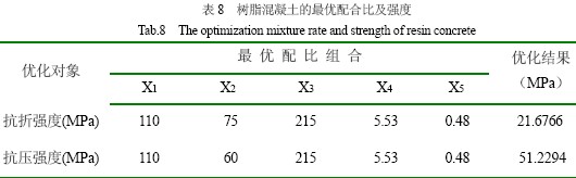 利用MATLAB 優(yōu)化工具箱中的fmincon 函數(shù),得出樹(shù)脂混凝土抗壓強(qiáng)度、抗折強(qiáng)度的最優(yōu)配合比,詳見(jiàn)表8。
