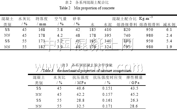 本試驗以100%垃圾熔渣粗骨料與細骨料來替代天然的石子和砂子,以水灰比0.45、0.55為變動因素。 因垃圾熔渣混凝土(簡稱SS 混凝土)的配合比設計在規范上沒有明確的規定,本試驗經多次試配,在滿足混凝土和易性的基礎上最后確定了垃圾熔渣混凝土的配合比。 表2 所示水灰比0.45、0.55 時垃圾熔渣混凝土以及對比用普通混凝土的配合比, 表3 所示水灰比0.45、0.55 時各混凝土的力學性能。