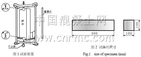 本試驗是根據日本工業基準JIS A 1129 規定的混凝土干燥收縮長度變化試驗方法(千分表法)[1], 把試件標準養護4 周之后,在恒溫(20±2) ℃, 恒濕相對濕度(60±5) %的試驗室內靜放, 使其自然干燥收縮,試件從試驗開始, 齡期分別達到一定程度之后,分別測出其干燥收縮長度變化以及質量減少率的方法。圖1 表示干燥收縮長度變化試驗裝置。