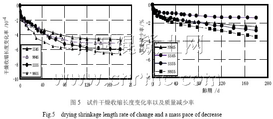 水灰比為0.45 時垃圾熔渣SS 混凝土以及對比用的普通NN 混凝土試件在干燥收縮齡期為180 d 后,干燥收縮長度變化率分別為4.6×10-4 和5.1×10-4,質量減少率分別為1.4 %和2.4 %。