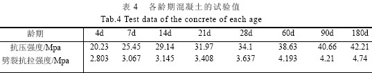 從表4 的試驗(yàn)結(jié)果可以看出,隨著齡期的增長(zhǎng),混凝土的抗壓強(qiáng)度單調(diào)增長(zhǎng),并且混凝土的抗壓強(qiáng)度在早期強(qiáng)度較低,4d 和7d 強(qiáng)度只分別達(dá)到28d 強(qiáng)度的59.3%和74%;并且混凝土的抗壓強(qiáng)度在90d 齡期以后仍然穩(wěn)定增長(zhǎng),28d 的抗壓強(qiáng)度只相當(dāng)于180d 抗壓強(qiáng)度的80.79%。因此,工程中粉煤灰混凝土結(jié)構(gòu)分析時(shí)采用28d 齡期的強(qiáng)度,在結(jié)構(gòu)運(yùn)行期有較大的強(qiáng)度富余,偏于保守。