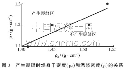 從表2 可以看出,對于試驗所用土質和干密度而言,槽孔內漿液的密度達到一定數值就可以使槽孔端部產生裂縫。這說明,堤身土體干密度和槽孔內漿液密度是槽孔端部土體產生裂縫的重要影響因素。隨著土體干密度的增大,產生裂縫的所需的漿液密度也增大,它們之間有一定的規律性(圖3)。