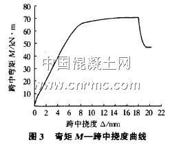 如圖3所示為梁的荷載一跨中撓度曲線,從圖中可以看出:曲線形狀基本能反映鋼筋混凝土適筋梁剪切破壞的受力特點,而且荷載一跨中撓度曲線與鋼筋混凝土梁的彎剪破壞形態非常類似,即當跨中彎矩最大截面的縱筋屈服后,由于裂縫的開展,壓區混凝土的面積逐漸減小,在荷載幾乎不增加的情況下,壓區混凝土所受的正應力和剪應力還在不斷增加,當應力達到混凝土強度極限時,剪切破壞發生,荷載突然降低。