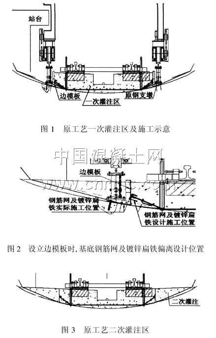 1)原施工工藝需兩次灌注,道床鋼筋網受邊模板影響,不能放置到設計位置,見圖1~3。
