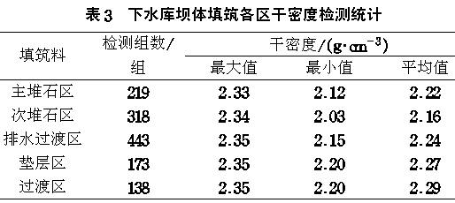 大壩填筑干密度試驗(yàn)均采用灌水法,每個(gè)填筑驗(yàn)收單元至少進(jìn)行1個(gè)干密度點(diǎn)檢測(cè)。各區(qū)干密度檢測(cè)情況如表3。