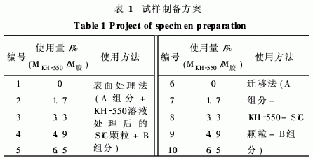 注:原料加入順序環氧樹脂+增韌劑+偶聯劑+SiC+固化劑+促進劑。按照表1制備1~10號試樣。熟化一段時間后澆注在處理好的模具中。