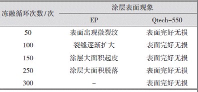 表2為混凝土保護涂層隨凍融循環次數增加的表面情況。從表2中可以看出:EP涂層經50次凍融循環就開始出現微裂紋,250次凍融循環時EP涂層已經大面積脫落,而Qtech-550涂層經300次凍融循環,表面仍完好無損。