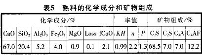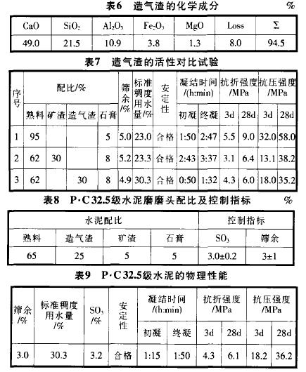 分別用與案例相同的造氣渣、黑色石灰石和低燒失量粉煤灰作主要混合材,礦渣為次要混合材,各試制500tP•C 32.5級水泥,在工程上試用,觀察其抗裂性、凝結速率和表面硬度。熟料化學成分和礦物組成見表5 .