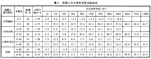 混凝土自生體積變形試驗原材料為三峽工程所用的葛洲壩525中熱水泥,安徽淮南平圩電廠的Ⅰ級粉煤灰,三峽花崗巖人工碎石、人工砂,ZB-1A緩凝高效減水劑,DH9引氣劑?;炷僚浜媳炔捎猛扑]的三峽工程大壩主要部位混凝土施工配合比,依據(jù)SD105-82規(guī)程試驗,試驗結(jié)果見表2,為便于對照表中同時列出MgO含量提高前的葛洲壩525中熱水泥混凝土的試驗結(jié)果。