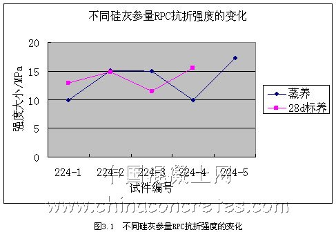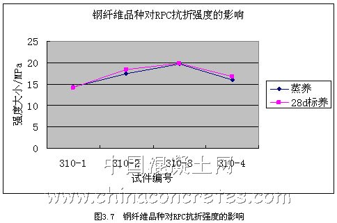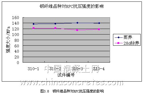 從圖3.7和3.8可以看出,鋼纖維的種類對RPC的抗壓強度影響不是很大,況且加入鋼纖維的目的也是為了加強RPC的韌性,即抗折強度,所以我們在選擇鋼纖維的種類上,應首先考慮其對抗折強度的影響。經過試驗研究和過往經驗,我們在本課題研究中選擇嘉興市經緯鋼纖維有限公司生產的平直型,規格為15-40mm,等效直徑為0.3-0.8mm;長徑比為30~60的鋼纖維。