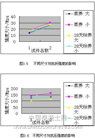 由表3.5和3.6 中我們可以看出對于抗折強度,大試件明顯高于小試件;而對于抗壓強度,小試件又明顯高于大試件。