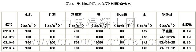 普通混凝土抗拉強度與抗壓強度之比非常低,表現為很大的脆性,而在普通混凝土中經常使用鋼筋來彌補普通混凝土的這方面的不足;從已有的實驗結果表明,活性粉末混凝土的抗拉強度與抗壓強度之比一般為1/8左右,與普通混凝土相比已有很大的提高,但仍然表現為很大的脆性,而通常采取在活性粉末混凝土中加入鋼纖維來提高其韌性。在活性粉末混凝土中加入鋼纖維,能起到較好的增強、增韌作用,但同時又大幅度提高了活性粉末混凝土的配置成本。為此,試圖通過試驗來尋找鋼纖維摻量的活性粉末混凝土在性能和成本上理想結合點,表3.3為鋼纖維摻量對活性粉末混凝土性能影響的配合比。