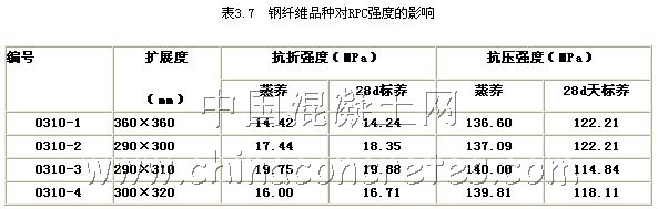 鋼纖維增強作用隨長徑比增大而提高,鋼纖維長度太短不起增強作用,但纖維太長會影響拌和物的和易性和施工質量,甚至導致強度降低;直徑太細易在拌和過程中被彎折,太粗則在同樣體積率時增強效果差。因此在固定鋼纖維體積率(2%)的情況下,實驗對比研究了4種不同品種鋼纖維對RPC強度的影響,如表3.6: