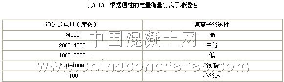 在本試驗中,我們采用電指標顯示 RPC抗氯離子滲透性指標的實驗方法,即(ASTM--C1202-97),本方法是以確定混泥土的電導,來快速顯示混泥土的抗氯離子滲透性,通過監測切取自公稱直徑為102mm的芯樣或圓柱體的厚度為51mm的混泥土薄片試片在6h期間通過的電流,試片一端侵入氯化鈉溶液中,另一端侵入氫氧化鈉溶液中,并在試片兩端施加并保持60V的直流電壓。通過的總電量也是片的抗氯離子滲透性有明顯的關系。據資料可得: