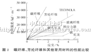 芳綸纖維和碳纖維作為結構補強領域的新型非金屬復合材料,具備幾個特點:1) 高彈性模量,高抗拉強度;2) 低密度;3) 耐久性好,抗腐蝕、耐老化;4) 疲勞強度高;5) 各項異性;6) 應力—應變關系為線性(見圖1) 。