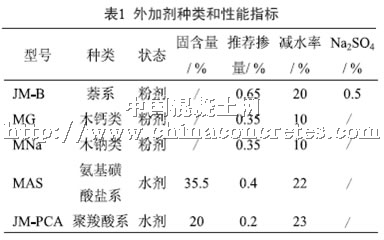 外加劑:江蘇建科院有限公司生產的JM-B萘系高效減水劑、木鈣MG、木鈉MNa、氨基磺酸鹽高效減水劑MAS、JM-PCA聚羧酸高效減水劑。性能指標見表1。